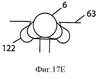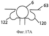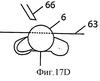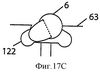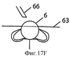 Фиг.17А-F показывает положение зазубрин в зажимном приспособлении 63 перед резанием нити и после него для случая нити, зазубрины которой отстоят друг от друга на 120 градусов. На фиг.17А зажимное приспособление показано разомкнутым, нить 6 не надрезана, выемки 120, 122 зажимного приспособления не используются. На фиг.17В зажимное приспособление показано сомкнутым и блок 66 лезвий готов надрезать нить 6. На фиг.17С зажимное приспособление показано разомкнутым после того, как первая совокупность зазубрин была вырезана и помещена в выемку 122. На фиг.17D зажимное приспособление показано сомкнутым перед тем, как блок 66 лезвий входит во взаимодействие с нитью 6 для вырезания второй совокупности зазубрин. На фиг.17Е зажимное приспособление показано разомкнутым с двумя совокупностями зазубрин, помещенных в выемки 120, 122. На фиг.17F зажимное приспособление показано сомкнутым перед тем, как блок 66 лезвий входит во взаимодействие с элементом нити 6 для ее надрезания. После надрезания нить 6 снимают и исследуют. Специалисту в данной области техники очевидно, что для предохранения зазубрин во время последующих этапов резания можно предусмотреть дополнительное или меньшее число выемок.