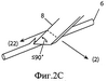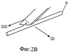 Как показано на фиг.2В, движение вперед в направлении (22) и вдоль поперечного направления (2) позволяет сделать более длинный разрез в нити 6 по сравнению с фиг.1, поскольку в случае фиг.1 длина зазубрины определяется геометрической формой лезвия и его движением вдоль оси X, в то время как в случае фиг.2 длина зазубрины определяется геометрической формой лезвия и его движением вдоль обеих осей Y и X. Это более длинное режущее действие происходит в направлении Y. Фиг.2С показывает завершенный надрез нити 6, выполненный за счет непрерывного движения в направлении (2) в сторону от нити.