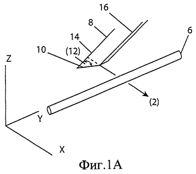 В этой связи, фиг.1А иллюстрирует последовательное режущее движение поперек нити 6 лезвия 8, обладающего одной степенью свободы по подвижности и двумя степенями свободы по геометрии. Одна степень свободы по подвижности подразумевает движение в одном направлении в трехмерной “X-Y-Z” схеме. На фиг.1А направление (2) соответствует поперечной оси X, проходящей через надрез в нити 6, причем по направлению (2) происходит движение лезвия 8 до завершения резания. Кромка 10 лезвия 8 имеет угол (12) в геометрии лезвия 8, образованный между краями его сторон 14, 16, а также угол в геометрии лезвия 8, образованный между его верхней и нижней плоскостями (не показан). Такая геометрическая форма обеспечивает действие лезвия в измерениях Y и Z (т.е. по длине и глубине зазубрины) только за счет его смещения 8 в направлении X.