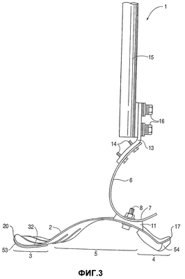 Тыльная сторона участка 5 среднего отдела стопы и участок 3 переднего отдела киля стопы образуют обращенную вверх вогнутость 32 на фиг.3 таким образом, что это имитирует функционирование пятилучевой оси при движении стопы человека. А именно, вогнутость 32 имеет продольную ось С-С, которая ориентирована под углом от 15° до 35° к продольной оси А-А киля стопы, причем медиальный участок находится в более переднем положении, чем латеральный участок, для того чтобы способствовать пятиосевому движению при ходьбе, подобно чередованию по косой низкой оси со второго по пятый элементы плюсны стопы человека.