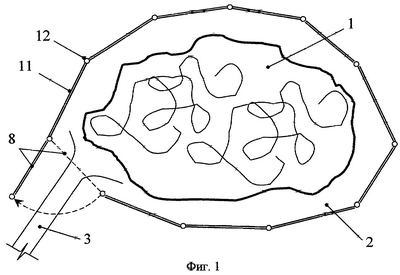 На фиг.1 изображена схема плана необустроенной свалки твердых бытовых или промышленных отходов. На фиг.2 – поперечный разрез свалки.