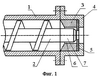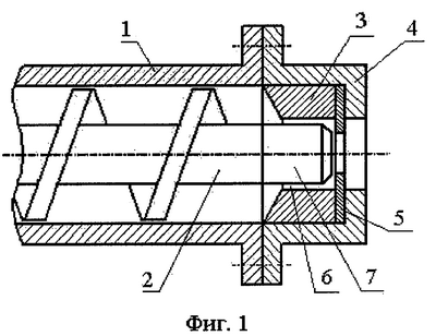 Пресс-экструдер содержит корпус 1, шнек 2, втулку 3, матрицу 4, формующую шайбу 5. Конечная часть шнека 2 выполнена в виде цилиндрического наконечника 7. Ширину и величину зазора 6 между втулкой 3 и наконечником 7 можно регулировать, поменяв втулки 3. Диаметр наконечника должен быть равен внутреннему диаметру шнека, чтобы обрабатываемый продукт полностью вошел в зазор 6. При выполнении этого условия можно уменьшить потери давления при нагнетании в зазор 6, что приводит к уменьшению энергоемкости процесса. Длина формующей шайбы 5 от 3 до 5 мм, а также расстояние между торцом наконечника 7 и формующей шайбой 5 должно быть в пределе от 1 до 2 мм, чтобы продукт без особого усилия после зазора 6 мог свободно течь наружу. Формующую шайбу 5 можно не применять в случае, когда не нужно придать особую форму получаемому продукту, так как после зазора 6 продукт уже получает кольцевую форму.