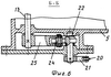 В нише в теневой зоне за реданом 8 установлен ковш 9, установленный на оси вращения 10, управляемый механизмом перемещения (гидроцилиндром) 11 через рычаг качалки 12, жесткозакрепленный на конце промежуточной оси 13, выходящем в гермоотсек, а внутри корпуса водозаборного устройства 3 на промежуточной оси 13 установлен жестко рычаг 14, шарнирно соединенный тягой 15 с боковиной ковша 9. В корпусе 5 водозаборного устройства 3 установлена заслонка 16, шарнирно закрепленная на рычаге 17, который жестко закреплен на оси вращения заслонки 18, конец которой выходит в гермоотсек, на котором установлен жестко рычаг 19, связанный через тягу 20 с рычагом 21, жестко сидящем на оси 22 ведомой вилки 23, которая контактирует с пальцем 24 ведущего кругового сектора 25, жестко закрепленного на конце промежуточной оси 13, вынесенном в гермоотсек.