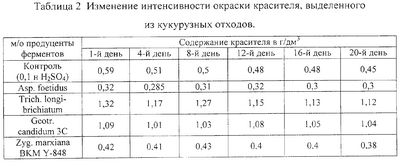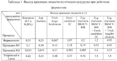 Изобретение относится к пищевой промышленности, в частности к способу получения натуральных пищевых красителей из растительного сырья. Способ предусматривает подготовку сырья путем его последовательной обработки. При этом предварительно готовят гидролизующий агент путем культивирования микроорганизмов Zygofabospora marxiana BKM Y-848, Geotrichiatum candidum 3C или их смеси в соотношении 1:1. Затем приготовленный агент вносят в подготовленное сырье в количестве 0,01-0,04% на 1 г сухого сырья и проводят его ферментативный гидролиз в течение 1-2 ч. По истечении времени гидролиза ферменты инактивируют и проводят фильтрацию полученного раствора. После этого осуществляют двукратную промывку оставшегося на фильтре шрота и объединяют промывные воды и фильтрат с получением единого раствора, который затем упаривают до половины объема с получением красителя. Изобретение позволяет повысить выход красителя, улучшить его качество, эффективно использовать отходы кукурузного сырья, вести экологически чистый процесс получения красителя при упрощении его технологии. 2 с. и 8 з.п. ф-лы, 2 табл.