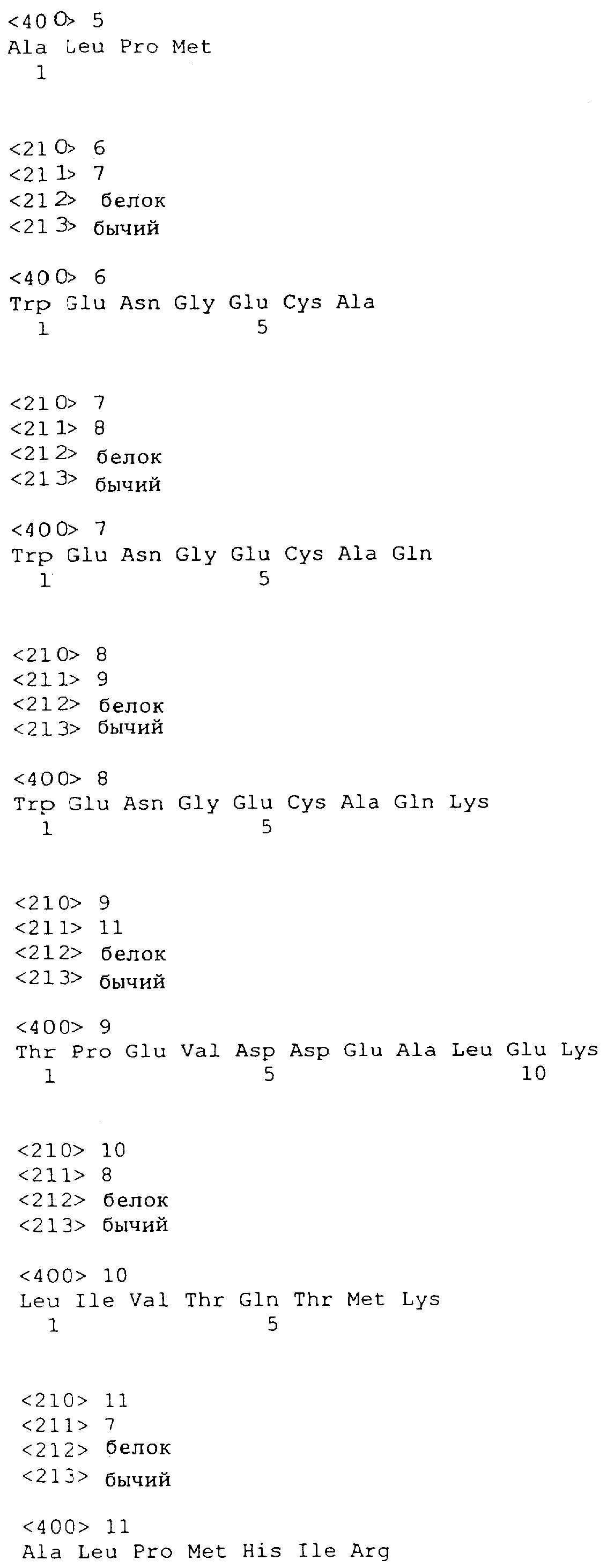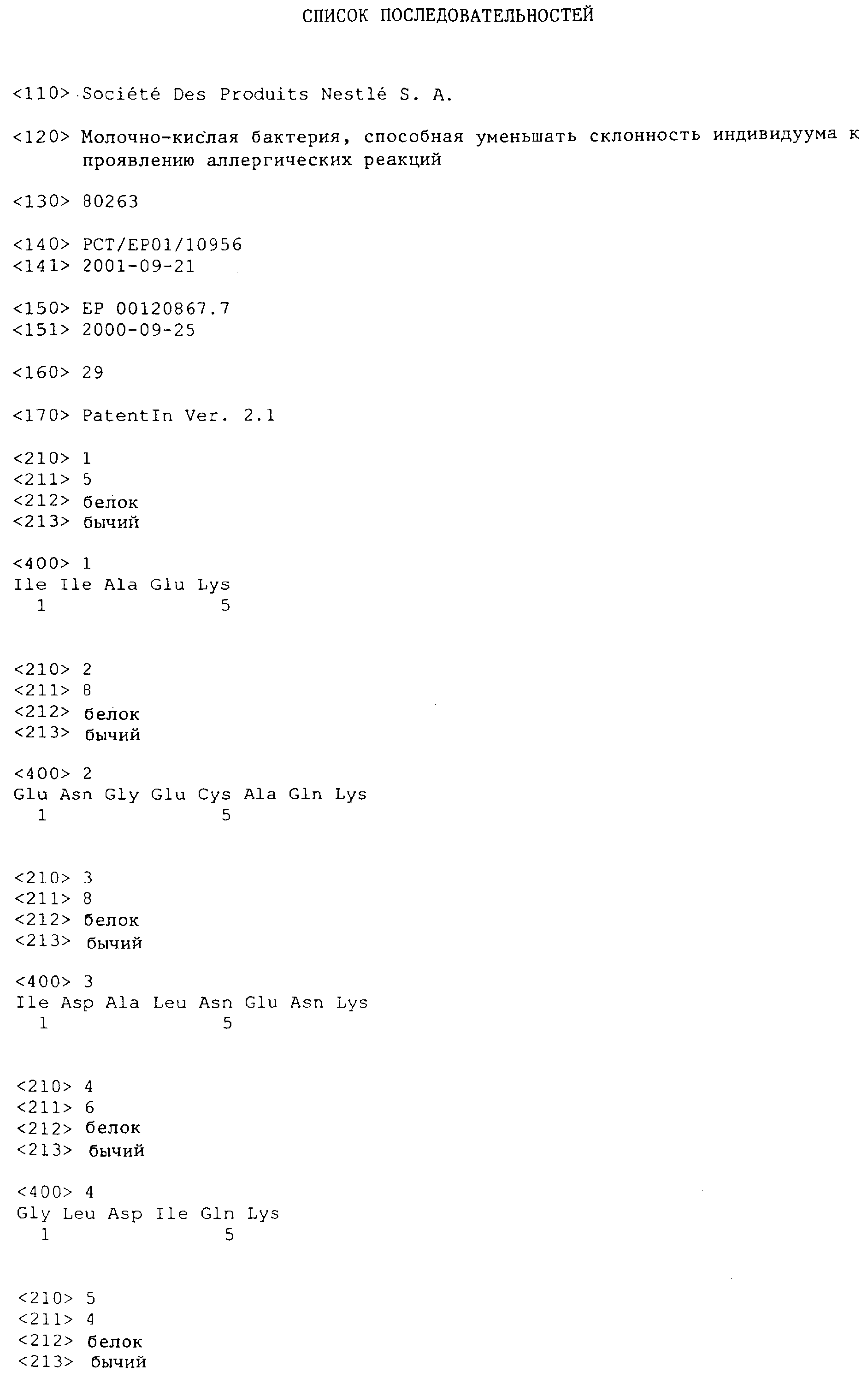 В пока еще не опубликованной заявке на патент ЕР 99200130.5, поданной автором настоящей заявки, раскрывается еще один подход. Предлагается гипоаллергенная композиция, содержащая неаллергенный, интенсивно гидролизованный белковый материал и/или свободную аминокислотную основу, а также, по крайней мере, один толерогенный пептид соответствующего аллергенного белка. Хотя такая композиция обладает рядом преимуществ над известными составами, пока еще трудно получать толерогенный пептид, который продуцировался бы для каждой партии de novo.