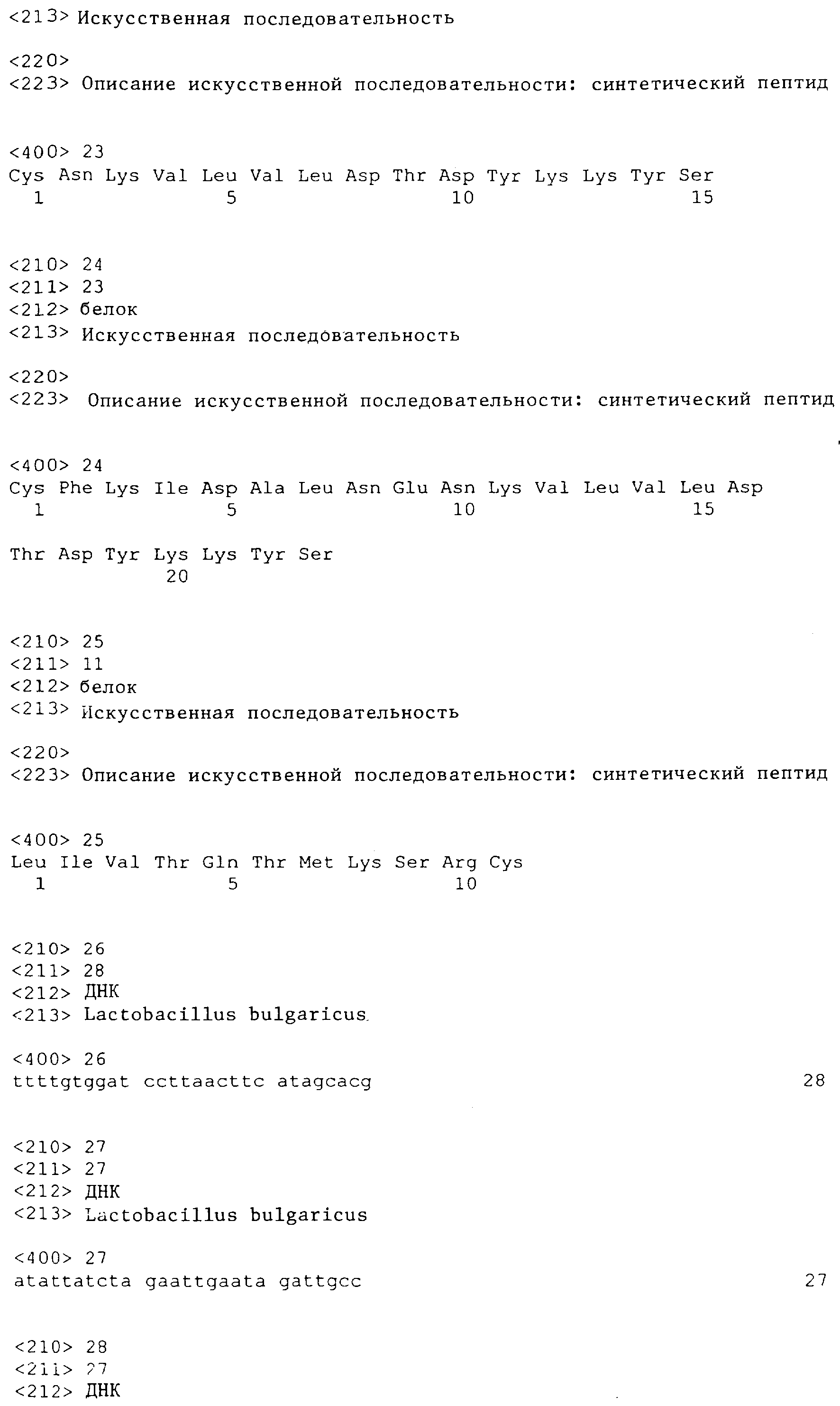 Толерогенный пептид, происходящий из какого-либо белка, вызывающего аллергию, обычно имеет мол. вес 200-600 Да и представляет собой пептид, способный индуцировать толерантность, по крайней мере, к белку, из которого он был получен. Такой пептид может индуцировать толерантность к любому материалу, имеющему такую же антигенную детерминанту (эпитоп), что и специфический толерогенный пептид. Согласно настоящему изобретению толерогенный пептид с помощью рекомбинантных методов встраивают в полипептид, синтезируемый в молочно-кислых бактериях, причем такой полипептид может быть как эндогенным, так и экзогенным по отношению к бактерии. Встраивание толерогенного пептида осуществляют таким образом, чтобы он оказался на периферии полученного в результате рекомбинантного полипептида и мог распознаваться иммунной системой.