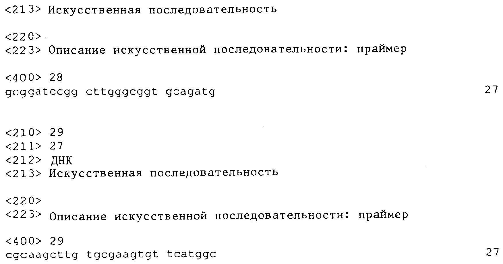 Специфический продукт PCR был получен с помощью Taq ДНК-полимеразы (Perkin-Elmer) и 3 циклов, включающих денатурацию 30 сек при 95°С, отжиг праймера 30 сек при 56°C и синтез 45 сек при 72°С, после чего проводили еще 27 циклов, доводя температуру на стадии отжига до 60°С.