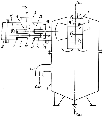 Сок или сироп с клеровкой подаются по трубе 5 и насадкам 9 с соплами 10 в камеру 8 смешения. Давление жидкости перед диском 7 поддерживается в пределах 0,2-0,3 МПа. Струи исходной жидкости вытекают из сопел с большой скоростью и поступают в соосно расположенные конусообразные отверстия 12, цилиндрические насадки 13 с диффузорами 14. При движении струй жидкости с высокой скоростью, создаваемой соплами 10, сернистый газ интенсивно эжектируется и смешивается с жидкостью при протоке через конусообразные отверстия 12 и насадки 13 с диффузорами 14. Диск 7 с насадками 9 может перемещаться при помощи эксцентрика 15. При его возвратно-поступательном движении регулируется процесс эжекции газа исходной жидкостью в камере 8 смешения.