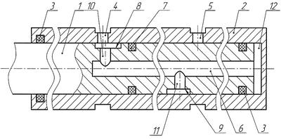 При полном входе плунжера 1 в цилиндр 2 за счет вращения плунжера нагнетательная выборка 9 выходит из сообщения с каналом линии нагнетания 5, а всасывающая выборка 8 начинает сообщаться с каналом линии всасывания 4. При вращении и выдвижении плунжера 1 из цилиндра 2 всасывающая выборка 8 сообщается с каналом линии всасывания 4, из которой жидкость через всасывающую выборку 8, всасывающее отверстие 10 и центральный канал 6 поступает в подплунжерную полость 12 цилиндра 2.
