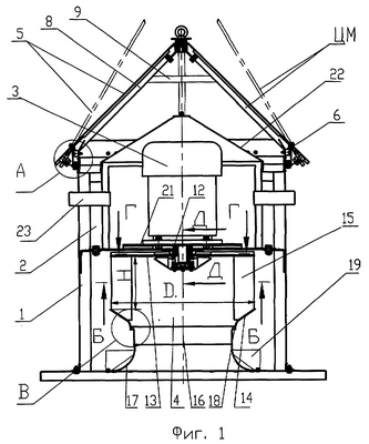 Двигатель 3 соединен с корпусом 1 посредством опоры. При выполнении двигателя 3 с узлами крепления вдоль его корпуса опора может выполняться в виде моторамы 20 с соединенными с корпусом 1 стойками и платформой между ними, на которой размещены узлы крепления двигателя 3 (фиг.3). При выполнении двигателя 3 с узлами крепления на переднем фланце, перпендикулярном валу двигателя 3, опора может выполняться в виде платформы 21, соединенной с корпусом 1 (фиг.1, 7). Двигатель 3 размещен в защитном кожухе 22, который может выполняться с двумя стенками (на фиг. не обозначено) с зазором между ними. Полость кожуха 22 посредством, по меньшей мере, одного воздуховода 23 (фиг.1, 2, 3) связана с окружающей средой (с атмосферой). Кожух 22 соединен с корпусом 1 посредством платформы 21 и/или воздуховодов 23 (фиг.1). Конструкция платформы 21 обеспечивает поступление воздуха из полости в кожухе 22 в пространство между платформой 21 и основным диском 13 рабочего колеса, например, за счет зазоров или отверстий в конструкции платформы 21.
