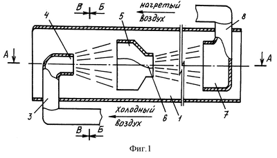 Таким образом, предлагаемый способ нагрева воздуха дымовыми газами и устройство для его осуществления позволяют уменьшить перемешивание газового и воздушного потоков с одновременным увеличением температуры нагрева воздуха и, следовательно, повысить качество получаемого горячего воздуха, экологические показатели охлажденных дымовых газов, уменьшить коррозионный износ металла, снизить аэродинамическое сопротивление устройства и, в конечном счете, увеличить его надежность и эффективность.