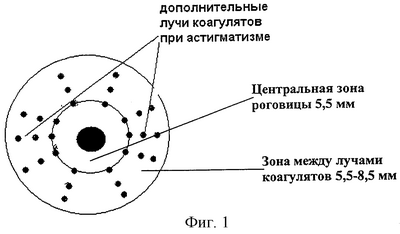 На фиг.1 показано расположение коагулянтов при радиальной и неравномерно-радиальной лазерной термокератопластике; на фиг.2 – расположение коагулянтов при лазерной секторальной кератопластике.