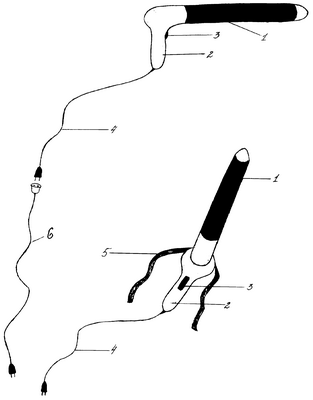 На чертеже изображено устройство для интраректального виброакустического массажа с инфракрасным излучением матки коров.