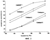 Образцы катализатора, представленные в Таблице 1, готовили на основе гидроксида циркония, который получали осаждением нитрата цирконила гидроксидом аммония при 65°С. Гидроксид циркония сушили при 120°С, и измельчали до образования частиц размером 40-60 меш. Готовили множество отдельных порций гидроксида циркония. Готовили растворы сульфата аммония или соли металла (компонент 1), которые добавляли в образцы гидроксида циркония. Полученные материалы подвергали кратковременному перемешиванию и затем сушили вращением на воздухе при 80-100°С. После этого импрегнированные образцы сушили в муфельной печи при 150°С в течение двух часов в атмосфере воздуха. Приготовленные растворы сульфата аммония или соли металла (компонент 2, отличающийся от компонента 1) добавляли к высушенному материалу. Полученные образцы кратковременно перемешивали и сушили вращением. После этого образцы прокаливали при 600-700°С в течение 5 часов. Твердый материал пропитывали приготовленными растворами хлорплатиновой кислоты. Образцы подвергали окончательному прокаливанию на воздухе при 525°С в течение 2 часов. В представленной ниже Таблице 1 индекс “А” означает, что катализаторы получали при содержаниях модификатора 1, 2, 3 и 4 мас.%; “В” означает, что катализаторы получали при содержаниях сульфата 6, 7 и 8 мас.% и “С” означает, что катализаторы получали при содержаниях платины 0,25, 0,5, 0,75 и 1 мас.%.