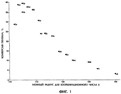 По методике, описанной в примере 1, готовили катализаторы, содержащие 2 мас.% модификатора, 0,4 мас.% платины и 7 мас.% сульфата. Примерно по 95 мг каждого образца загружали в испытательную установку с большим числом единичных реакторов. Катализаторы предварительно обрабатывали на воздухе при 450°С в течение 2-6 часов и восстанавливали при 200°С в атмосфере Н2 в течение 0,5-2 часов. Затем при 150°С, давлении около 1 атм через образцы пропускали смесь 8% пентана с водородом с WHSV (среднечасовая объемная скорость) 2,5 ч-1 (в расчете только на пентан). Продукты реакции анализировали с использованием он-лайн хроматографа и полученные результаты представлены на фиг.1, причем тестирование иттербийсодержащего катализатора дублировали. На фиг.1 представлен график зависимости конверсии пентана в процентах от величины ионных радиусов лантанидов с координационном числом 8 или иттрия, которые использовали для модификации катализатора, представляющего собой платину, нанесенную на сульфатированный оксид циркония. Ионные радиусы взяты из книги Huheey, J.E.Inorganic. Chemistry-Principles of Structure and Reactivity, nd Ed.; Harper & Row: New York, 1978. Как видно из приведенного графика, максимальная конверсия достигается при величине ионного радиуса 112 пикометров (иттербий). При ионных радиусах выше 115 пикометров наблюдалось быстрое падение активности.
