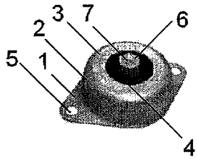 1. Виброопора, содержащая корпус и упругий элемент из эластомера, отличающаяся тем, что корпус выполнен в виде нижнего фланца в форме ромба со скругленными углами при вершинах, жестко связанного со втулкой, ось которой совпадает с точкой пересечения диагоналей ромба и выполненной в виде цилиндрического кольца, связанного с буртиком, плоскость которого перпендикулярна оси цилиндрического кольца, а во втулке жестко закреплен эластомер в виде цилиндрического диска, причем в нижнем фланце расположены крепежные отверстия, а в эластомере жестко установлен крепежный элемент в виде шестигранной призмы с резьбовым отверстием внутри.
