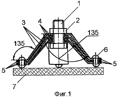 При воздействии внешней нагрузки упругие элементы 3 и 4 деформируются в осевом и радиальном направлениях. Радиальная деформация упругих элементов сопровождается изменением величины диаметра центров заклепок 6 и взаимного трения между заклепками из фрикционного материала и основанием 7, которое также может быть выполнено из фрикционного материала. Чередование взаимного расположения плоских пружин 3 и 4, составляющих упругие элементы арочного типа, во взаимно перпендикулярных направлениях обеспечивает наличие зазора между плоскими пружинами, что исключает их взаимное трение при деформациях упругого элемента. Благодаря функциональному разделению конструктивных узлов на упругие и демпфирующие элементы, а также простоте их сборки, обеспечивается оперативный подбор упругодемпфирующих характеристик виброизолятора для конкретных условий эксплуатации.