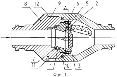 Установить ушко 4 тарелки 3 (Фиг.1, 3) в проушинах 2 (Фиг.2) седла 1 (Фиг.1, 3) при этом уплотнительные поверхности седла и тарелки расположить соосно. Затем уплотнительные поверхности соединить и произвести совместную обработку отверстия под ось 5 (Фиг.2) и установить последнюю. Установить седло 1 (Фиг.1, 3) в сборе с тарелкой 3 и осью 5 в часть корпуса 8, установив между ними герметизирующую прокладку 7 из упругого материала, например из терморасширенного графита. Закрепить резьбовой втулкой 6 седло 1 в части корпуса 8. Соединить части корпуса 8 и 9 между собой при помощи резьбы 12, установив между их торцами уплотняющую прокладку 10 из упругого материала, например из терморасширенного графита. Зафиксировать резьбу 12 при помощи штифта 11.