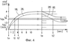 На фиг.4 и 5 пунктирные линии используются для изображения типичных кривых 28L и 28S э.д.с. (мВ) / t (с), соответствующих отклику термопары 20 прототипа (Фиг.2), нагреваемой большим пламенем F1 или маленьким пламенем F2, соответственно, и типичной кривой остывания 28С после погасания племени. Максимальное пороговое значение “разблокировки арматуры” Ve приводов некоторых предохранительных клапанов SV в общем объеме составляет примерно 2,5 мВ под нагрузкой, поэтому начальное время “t1′-t0” нагрева пламенем F1 составляет примерно 4 секунды (фиг.4), а пороговое значение Vde в том же приводном устройстве для “разблокировки арматуры” и выключения клапана составляет 2,2 мВ, немногим менее вследствие гистерезиса “ Vde”, так что после погасания большого пламени F1 в момент времени “te” (фиг.5) отключение и закрытие клапана “SV” происходит после временного интервала “t3′-te” примерно в 20 секунд. Тем не менее, вследствие разброса результатов производительности электромагнитного привода клапана SV некоторые устройства имеют пороговое значение разблокировки Vde-min примерно в 1 мВ под нагрузкой. В результате этого интервал остывания “t3′-te” для разблокировки привода SV, минимальное значение которого Vde увеличивается до 40 секунд (фиг.4).