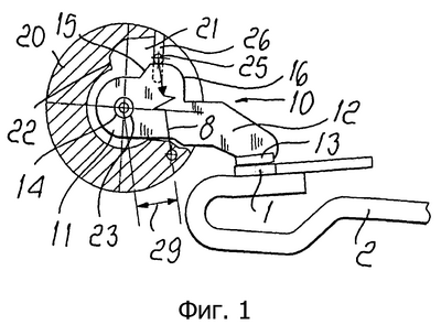 Кроме того, тот факт, что энергия, накопленная подвижным контактом во время его вращения, используется для получения эффекта, описанного выше, препятствует всей накопленной кинетической энергии разряжаться непосредственно на корпус автоматического выключателя, уменьшая каждую причину возможного дребезга подвижного контакта 10 и, следовательно, повторного пробоя электрической дуги. Этот положительный эффект может быть увеличен, если используются конструктивные конфигурации, показанные на фиг.1 и 2. В этих случаях центр 25 вращения под действием соответствующих пружин, связанных с ним и со связями 28 в варианте фиг.2, фактически расположен в опоре по отношению к стенке подобной кулачку поверхности 16; это взаимодействие облегчает генерацию силы, указанной стрелкой А, которая в конечном итоге создает момент, который стремится удержать активную поверхность 13 подвижного контакта 10, связанного с неподвижным контактом. Во время размыкания, вызванного коротким замыканием, вращение подвижного контакта 10 вызывает скольжение центра 25 вращения, который под действием пружин 8 взаимодействует с подобной кулачку поверхностью 16, оставаясь в прямом контакте с ним, с относительным скольжением частей в контакте; это приводит к вариации направления силы А с постепенным уменьшением плеча 29 ее рычага, пока, как подробно показано на фиг.4, взаимодействие между центром вращения и подобной кулачку поверхности не будет таким, чтобы поместить линию действия сил А под центром относительно центра 23 вращения и, следовательно, имеется плечо 29 рычага, знак которого является противоположным к начальной фазе. В этой ситуации, следовательно, существует механический момент, который согласуется с направлением вращения подвижного контакта 10, что помогает удерживать подвижный контакт 10 в положении, которого он достиг, противопоставляя любому дребезгу контактов и делая в сущности ненужным использование дополнительных релейных систем.