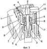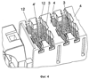 Во внутренней части эти гнезда или полости имеют особую конфигурацию с выступами, уступами и буртиками, образующими, с одной стороны, опоры 5 для размещения односторонних траверс опор фактических терминалов 3, а также опор 6 или уступов для краев указанных односторонних траверс опор терминалов 3, имеются также некоторые уступы 7, образованные для монтажных проводов 8. Аналогичным образом, гнезда или полости 2 разграничены на боковых поверхностях посредством соответствующих кромок 9, верхний край которых образует опору или уступ 10 прорези для соответствующего кабеля (провода) 8.