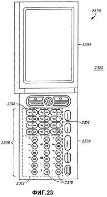 Обратимся теперь к фиг.23 и 24, на которых показано самоконфигурирующееся многоэлементное беспроводное портативное электронное устройство связи. Вариант выполнения содержит корпус 2300, имеющий первый элемент 2302 и второй элемент 2304. Корпус 2300 дополнительно содержит клавиатуру 2306, имеющую множество клавиш. Клавиатура 2306 может быть расположена на упомянутом первом элементе 2302. Корпус 2300 дополнительно содержит датчик (не показан), расположенный в упомянутом корпусе 2300 и обнаруживающий относительное положение упомянутого первого элемента 2302 относительно упомянутого второго элемента 2304. Наконец, корпус содержит контроллер клавиатуры (не показан), причем контроллер клавиатуры подсоединен к датчику, в котором первый набор клавиш 2308 из упомянутого множества клавиш упомянутой клавиатуры 2306 активизируется упомянутым контроллером клавиатуры под действием того, что упомянутый первый элемент 2302 находится в первом положении 2310 относительно упомянутого второго элемента 2304.