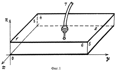 В предлагаемом способе объем диэлектрика между проводящими поверхностями в экранирующей камере трехслойной конструкции “металл-диэлектри-металл” разделяется на полости (в помещении с прямоугольными поверхностями полости могут иметь форму параллелепипедов, показанных на Фиг.1, их общее число может равняться шести – по числу прямоугольных поверхностей). Верхняя 1 и нижняя 2 стенки полости металлические, левая 3, задняя 4, правая 5 и передняя 6 боковые стенки выполнены из радиопоглощающего материала – таким образом, все полости отделены друг от друга поверхностями с двухсторонним радиопоглощающим покрытием. Внутри полости имеется узел возбуждения 7 ЭМИ маскирующей помехи.