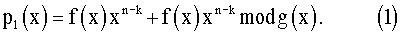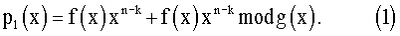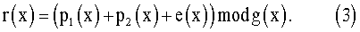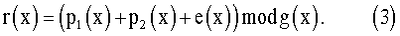 На приемной стороне входную последовательность р4(х) сначала делят на порождающий многочлен помехоустойчивого кода g(x): Деление кода БЧХ p1(x) на порождающий многочлен g(x), по определению кода, дает нулевой остаток. При делении отрезка синхронизирующей последовательности р2(х) на порождающий многочлен g(x), синхронизирующая последовательность не изменяется, поскольку она наложена на проверочную часть кода и, значит, степень ее меньше степени порождающего многочлена. Деление комбинации ошибок е(х) на порождающий многочлен кода, по определению, дает в остатке синдром кода s(x). Таким образом, при делении входной последовательности на порождающий многочлен в остатке получают сумму синдрома кода БЧХ и отрезка синхронизирующей последовательности: