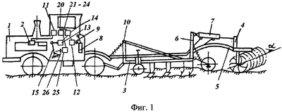 На чертежах приняты следующие обозначения: 1 – тяговое средство; 2 – датчик давления наддува турбокомпрессора двигателя; 3 – основная рама; 4 – дополнительная рама; механизм подъема: 5 – подвижная тяга, 6 – стояк, 7 – гидроцилиндр, 8 – гидрораспределитель, 9 – рычаг управления, 10 – гидронавеска; 11 – автоматический измеритель загрузки двигателя; 12 – первое исполнительное устройство перемещения; 13 – второе исполнительное устройство перемещения; 14 – управляющее устройство; 15 – рычаг переключения скоростей коробки передач трактора; 16 – согласующий усилитель; 17 – первый сравнивающий элемент; 18 – задающий элемент; 19 – первый компаратор; 20 – экстраполятор; 21 – определитель оптимума; 22 – формирователь команд обработки; 23 – блок уставок; 24 – второй компаратор; 25 – третье исполнительное устройство перемещения; 26 – рычаг рейки топливного насоса.
