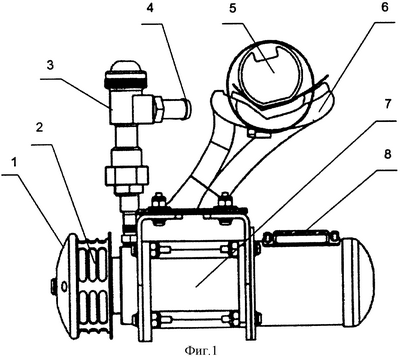 Роторный распылитель прикреплен к поперечной балке 5 с помощью пилонов 6. Цилиндрическая головка 1 распылителя закреплена на валу электродвигателя 7. Питание на мотор подается через разъем 8.