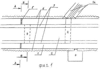 На фиг. 1 представлена схема осушения заболоченных лесов, на фиг.2 – разрез А-А по шлюзам регулирования уровня воды; на фиг.3 – разрез Б-Б по водопропуску под дорогой.
