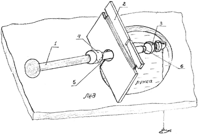 Чуткую настройку жерлицы под конкретного живца, применяемого в качестве приманки, осуществляют изменением соотношения плеч стержня-сигнализатора (принцип безмена) после установки жерлицы на ребро подставки над лункой и опускания в нее живца, насаженного на крючок оснастки. Затем лесу заправляют в прорези подставки и мотовильца как показано на чертеже. При поклевке подставка в результате потяжки поворачивается плоскостью к лунке, стержень-сигнализатор глубже западает в отверстие подставки до ограничительного буртика, тем самым принимая устойчивое, близкое к вертикальному положение и сигнализируя о поклевке. Подсекают при поклевке как обычно, убирая подставку с лунки. При недосмотре возможна самозасечка за счет пружинящих свойств подставки и лесы.