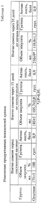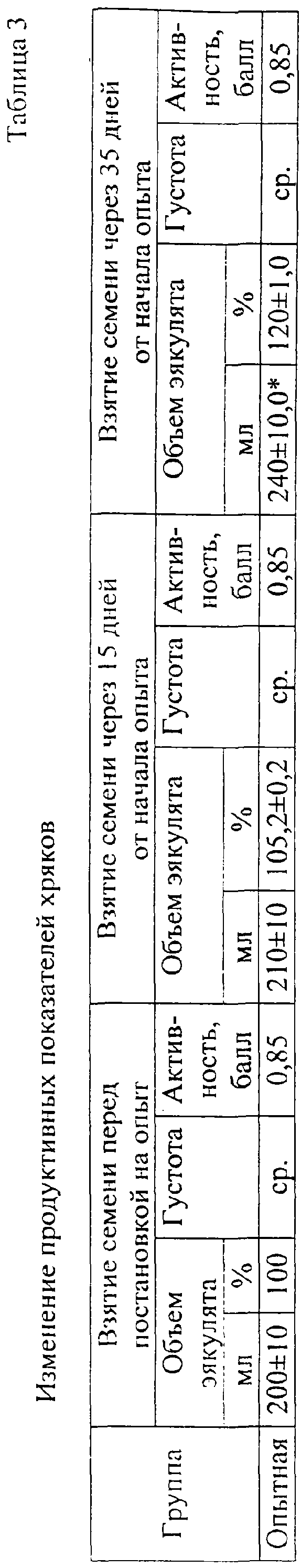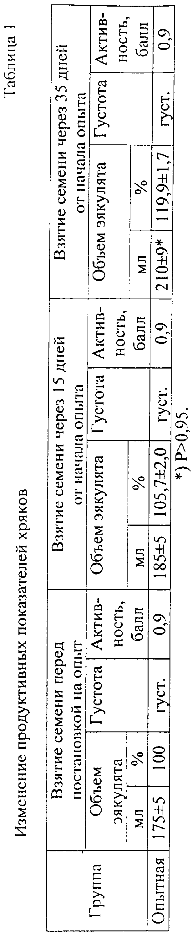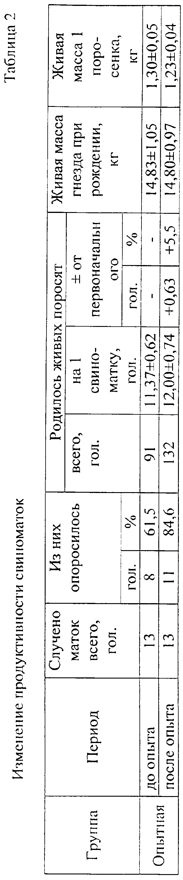 В муке из надземной части серпухи венценосной содержалось 0,3 мас.% 20-гидроксиэкдизона. После окончания скармливания новой белково-витаминно-минеральной добавки и проведения случки были получены следующие данные (табл.1 и табл.2). Хряки улучшили свою продуктивность по сравнению с предыдущими показателями. Наибольшее увеличение объема эякулята произошло через 35 дней после дачи добавки. В результате случки фертильность хряков повысилась с 61,6 до 84,6%, а выход поросят на одну свиноматку – на 0,63 головы. Пример 2. Хряки в весенний период получали сбалансированный по основным питательным элементам комбикорм. В мае-июне в течение 35 дней до случки к 70,0-75,0% зерновой части рациона включали 25,0-30,0 мас.% опытной белково-витаминно-минеральной добавки следующего состава (%):