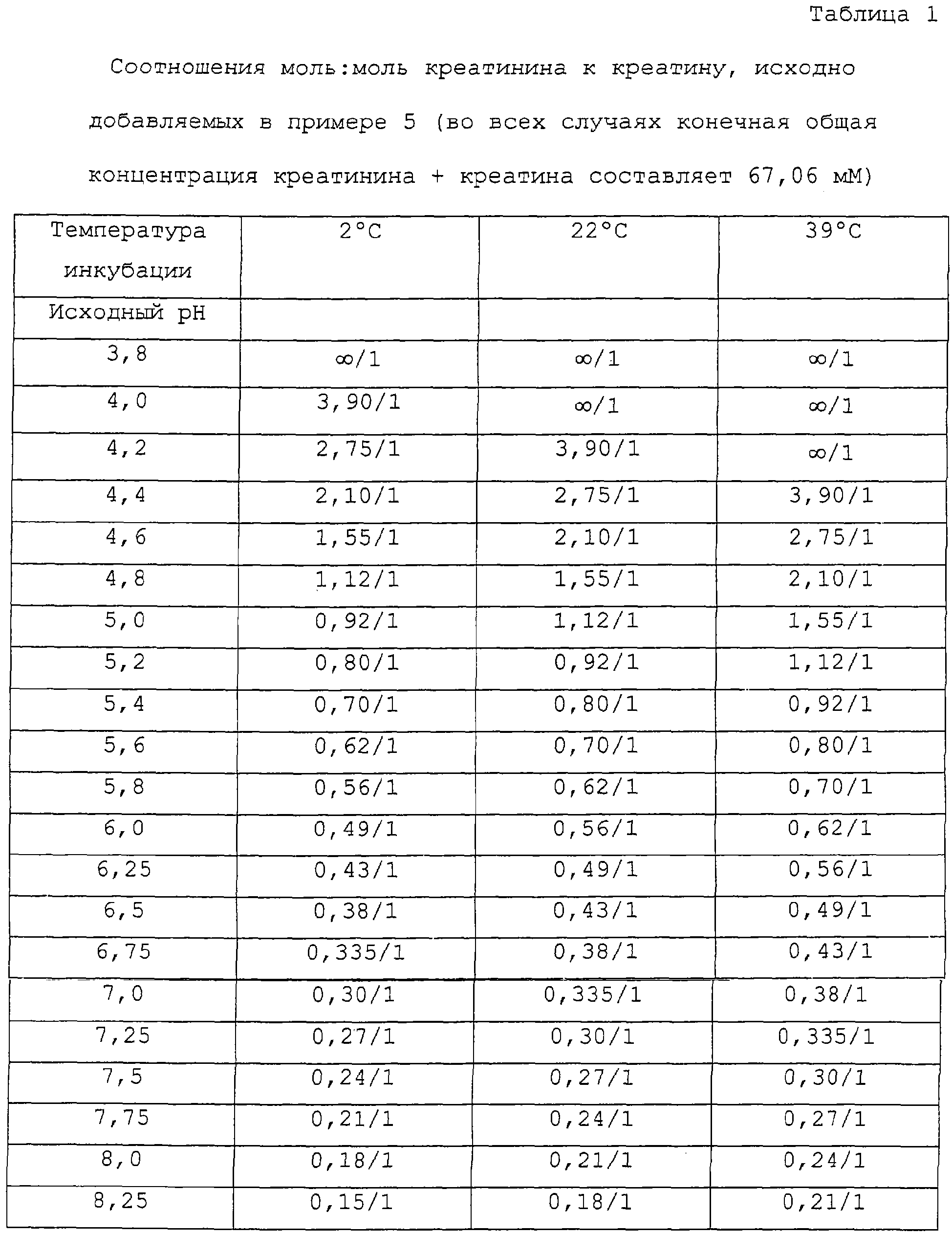 На фиг.7 представлен график соотношения моль:моль креатинина к креатину в зависимости от рН для растворов, стабильных через 6 недель инкубации при 2°С, 22°С и 39°С (как описано в примере 5).