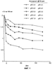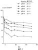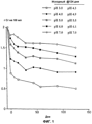 На фиг.1 и 2 представлены графики концентрации креатина (в граммах на 100 мл и в процентах от исходной концентрации, соответственно) в растворах при различных рН по отношению ко времени (как описано в примере 2).