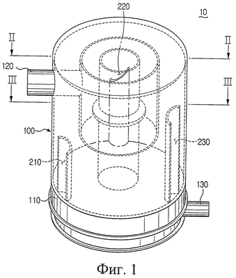 Дополнительно настоящее описание изобретения предполагает наличие и другого числа, большего трех, пылеотделительных камер, предназначенных для сбора микроскопических частиц пыли, которые также могут быть расположены с равными промежутками вокруг внутренней боковой стенки 100b корпуса 100. Чем больше пылеотделительных камер используется, тем выше эффективность сбора микроскопических частиц. Однако увеличение числа пылеотделительных камер приводит к усложнению конструкции корпуса 100, что дополнительно увеличивает производственные издержки и усложняет производственные процессы. Следовательно, является предпочтительным наличие трех пылеотделительных камер, т.е. камер 210-230, с первой по третью, которые расположены на внутренней боковой стенке 100b корпуса 100 под углом около 120° по отношению друг к другу.