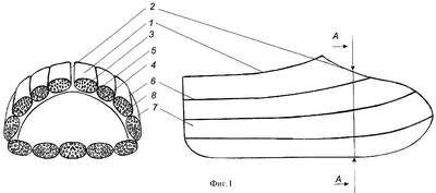 Устойчивая объемная форма вставки достигается за счет ее конструкции (фиг.2), которая представляет собой деталь развертки внутренней поверхности обуви с двумя конструктивными членениями: 1 – в носочной и 2 – в пяточной частях.
