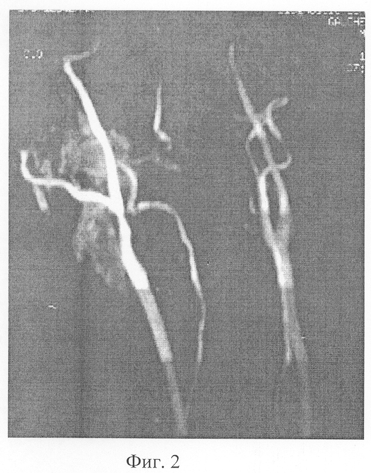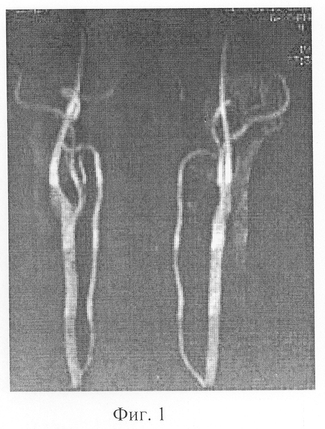 На фиг.1 – магнитно-резонансная ангиограмма магистральных артерий головы, выполненная при срединном сагиттальном положении головы пациента. Отмечается небольшая волнистость хода правой и левой позвоночных артерий.