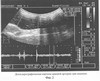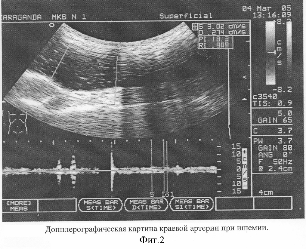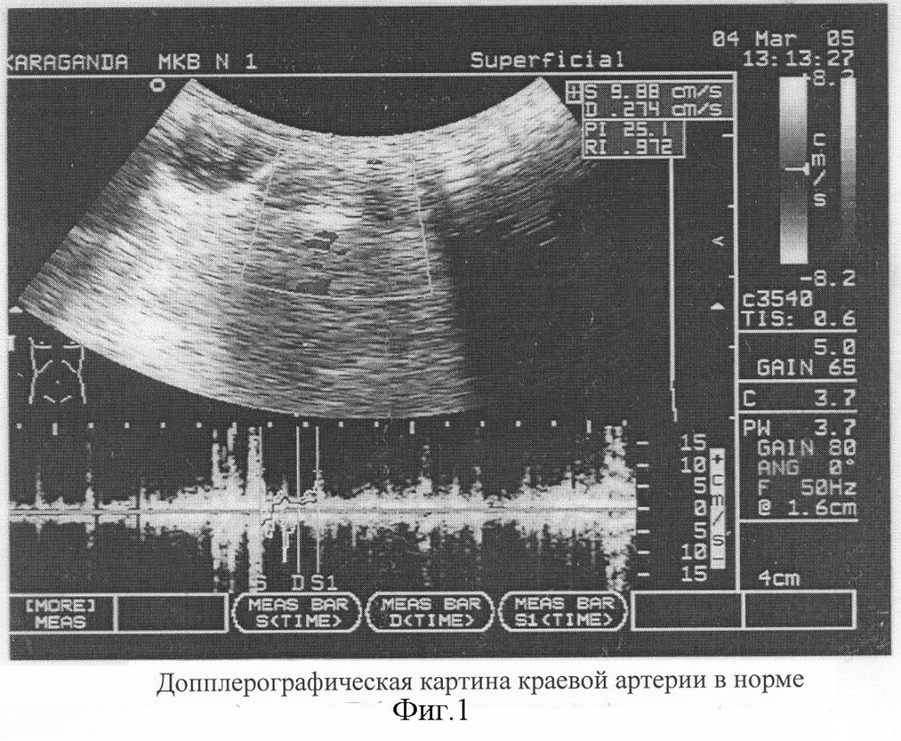 Способ осуществляется следующим образом. После лапаротомии при необходимости оценки жизнеспособности сегмента ободочной кишки пальпаторно определяют расположение краевого сосуда исследуемого сегмента ободочной кишки и явно жизнеспособного сегмента. На брыжейку в проекции краевого сосуда укладывают резервуар, заполненный жидкостью (хирургическая перчатка, наполненная изотоническим р-ром). Через полученное эхоокно проводится ориентировочное сканирование в В режиме конвексным неоперационным датчиком с частотой 5 или 7,5 МГц. После визуализации краевого сосуда в режиме цветного доплеровского картирования измеряют скоростные характеристики кровотока в режиме PW (фиг.1).