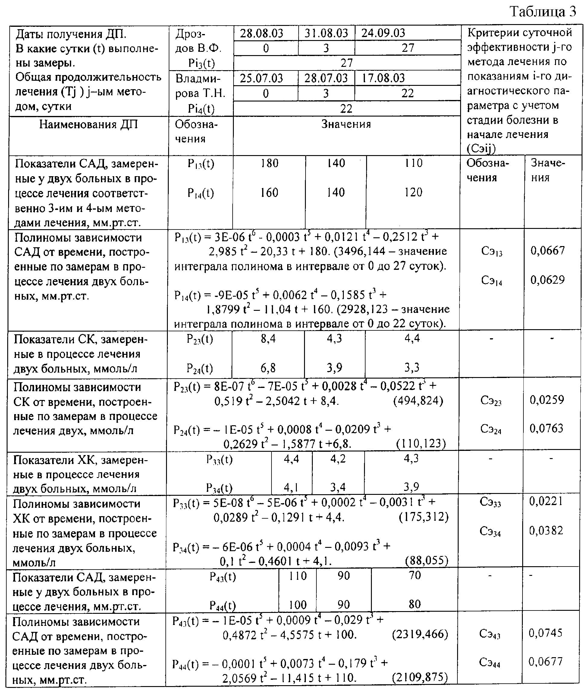 Рассмотрим конкретный пример применения предложенного метода, исходные данные и результаты расчетов для которого по формулам (1) и (2) приведены в табл.2. В табл.2 полиномы Pij(t) находятся на основании замеренных показаний i-х диагностических параметров за периоды лечения Tj для соответствующих j-х методов лечения. Математические выражения для полиномов Pij(t) находились с помощью программы «Мастер» в среде Excel.