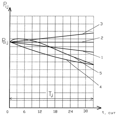 Результат лечения каким-либо из j-х методов лечения может быть разный, а именно когда i-й диагностический параметр Рij(t) за период лечения улучшен, остался на прежнем уровне или произошло его ухудшение (фиг.1, поз.1, 2, 3, соответственно). При этом характер изменения Pij(t) за период лечения Tj может быть линейным или нелинейным (см. фиг.1, поз.1, 2, 3 и поз.4, 5, соответственно), возрастающим, убывающим.