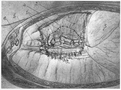 На чертеже для ориентировки обозначено: 3 – диафрагма, 5 – трахея, 6 – пищевод. Предложенный способ закрытия дефекта перикарда доступен и надежен для практического применения.