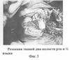 13.04.03 г., больному проведена операция – верхняя шейная диссекция, после чего, через центральную мандибулотомию проведена резекция 1/2 языка и тканей дна полости рта. Выделена левая лицевая артерия и левая наружная яремная вена. В средней трети левого предплечья сформирован кожно-фасциальный лучевой лоскут в виде двух кожных элементов трапециевидной формы на общем основании из глубокой фасции предплечья. Размеры кожных элементов соответствовали размерам дефектов слизистой полости рта и языка и наружных покровов поднижнечелюстной области. Питающая ножка лоскута была представлена лучевой артерией и сопровождающими ее лучевыми венами. После мобилизации лоскута признаков нарушения кровоснабжения кожных элементов не отмечено. После пересечения сосудистой ножки лоскут был перенесен в зону дефекта и сложен пополам, кожными поверхностями наружу. Кожа лоскута, в месте сгиба, рассечена до фасциального основания. Листки глубокой фасции по периметру лоскута сшиты между собой, чтобы защитить сосудистую ножку от возможного инфицирования. Латеральный край одного из кожных элементов путем наложения трансоссальных швов фиксированы к внутренней поверхности тела нижней челюсти. Медиальный край сшит с краями слизистой языка и слизистой дна полости рта отдельными узловыми атравматическими кетгутовыми швами в два этажа. Края второго кожного элемента сшиты с краями кожи по периферии дефекта в поднижнечелюстной области. Ножка лоскута проведена под кожей на боковую поверхность шеи, где наложены микроанастомозы конец-в-конец между лучевой и лицевой артериями, а также между наружной яремной веной и лучевыми венами в месте их слияния. После пуска кровотока восстановилось кровообращение в лоскуте. После чего проведен остеосинтез нижней челюсти по линии центральной мандибулотомии титановой минипластиной. Раны в области реципиентных сосудов ушиты послойно. Донорская рана на предплечье закрыта расщепленными кожными лоскутами. В послеоперационном периоде признаков нарушения кровоснабжения лоскута и нагноения раны не наблюдалось. Назогастральный зонд удален на 9-е сутки, после чего больной питался естественным путем. Расщепленная кожа в донорской зоне прижилась полностью, функция предплечья и кисти не нарушилась. Больной выписан 27.04.03 г. Период стационарного лечения составил 14 койко-дней. Отмечен удовлетворительный функциональный и эстетический результат.