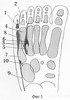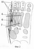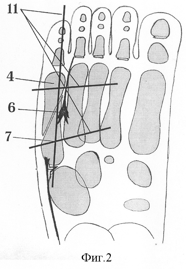 На фиг.2 представлена схема стопы после реконструкции, поз.4 – дистальный фрагмент пятой плюсневой кости; поз.6 – межкостные мышцы; поз.7 – проксимальный фрагмент шестой плюсневой кости; поз. 11 – спицы Киршнера.