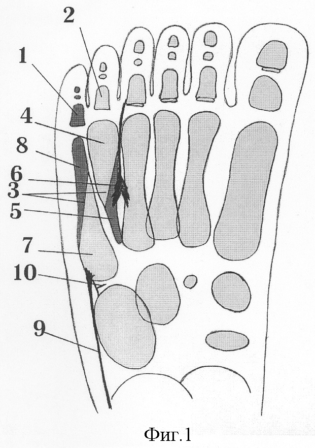 На фиг.1 представлена схема стопы с удвоением пятого луча во время реконструкции, поз.1 – шестой палец стопы; поз.2 – пятый палец стопы; поз.3 – остеотомия пятой и шестой плюсневой кости; поз.4 – дистальный фрагмент пятой плюсневой кости; поз. 5 – проксимальный фрагмент пятой плюсневой кости; поз.6 – межкостные мышцы; поз.7 – проксимальный фрагмент шестой плюсневой кости; поз.8 – дистальный фрагмент шестой плюсневой кости; поз.9 – короткая малоберцовая мышца; поз. 10 – капсулотомия плюсне-кубовидного сустава;