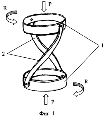 Предпочтительна уплощенная форма поперечного сечения тела активного элемента. Достижимость технического результата наглядно представляется из анализа работы активного элемента. На фиг.1 изображено в схематическом приближении устройство для коррекции патологических искривлений позвоночника. Два соосно расположенных кольца 1, имитирующих анатомические пояса для закрепления на туловище или конечности больного, соединены парой активных элементов 2. Каждый элемент выполнен из упругого (эластичного) проволочного материала в виде отрезка пологой цилиндрической спирали. Приложение внешнего воздействия в направлении условной оси устройства (например, сжимающего усилия Р с соответствующей оппозитной реакцией) приведет к сближению колец и взаимной ротации R. Применительно к действующему устройству коррекции искривлений позвоночника (или конечностей) этот эффект можно интерпретировать как сочетание дистракционно-контракционных и деторсионных усилий коррекции. Их соотношение, а следовательно, возможность выбора необходимых корригирующих напряжений, зависит от кривизны активных элементов, их количества и расположенности, а также от формы поперечного сечения элементов. Использование тел (стержней), уплощенных в поперечном сечении, приводит к увеличению ротационной составляющей напряжения деформации.
