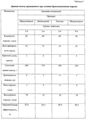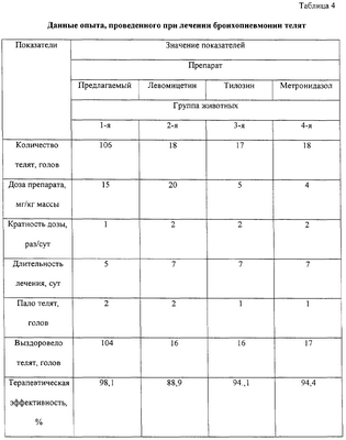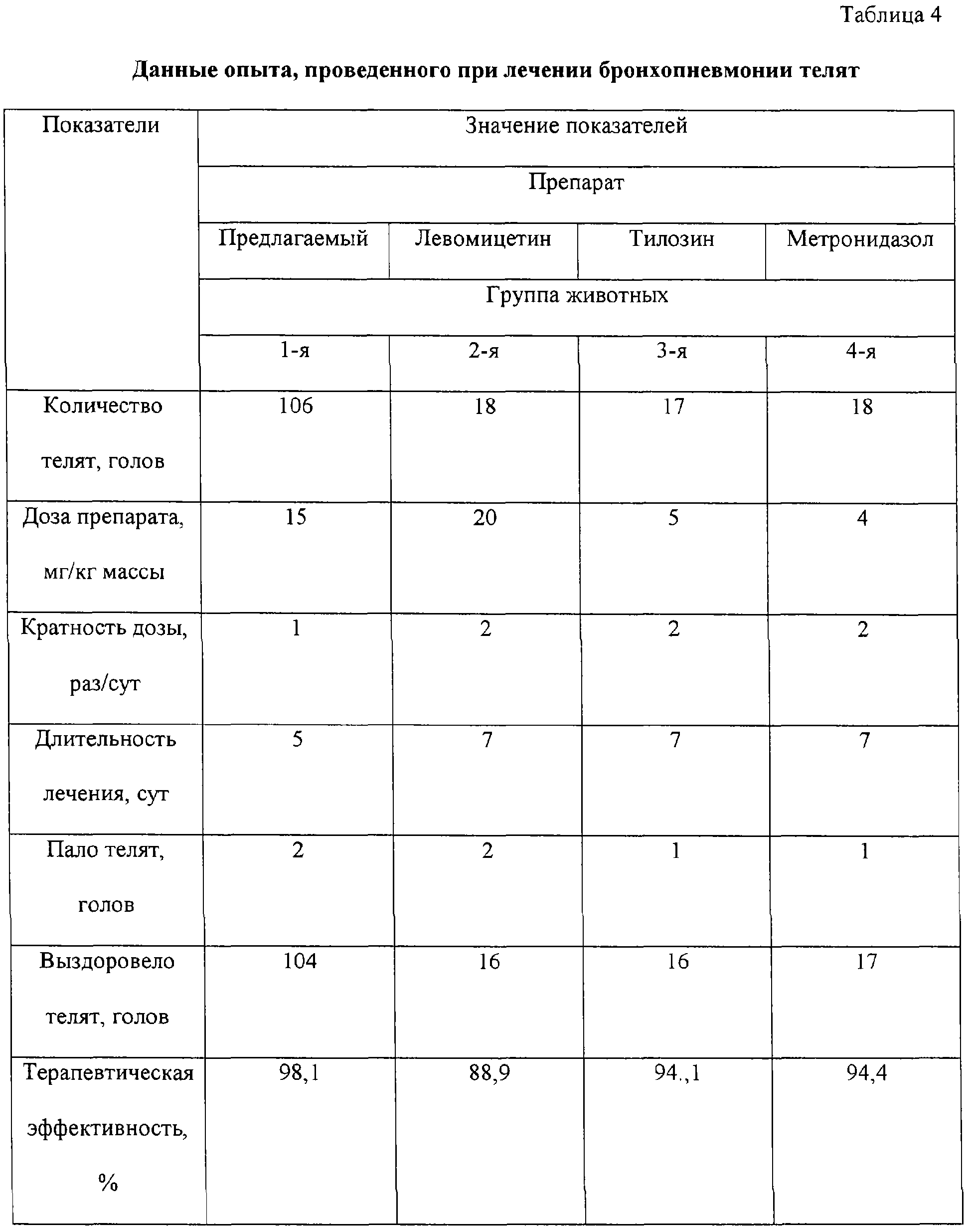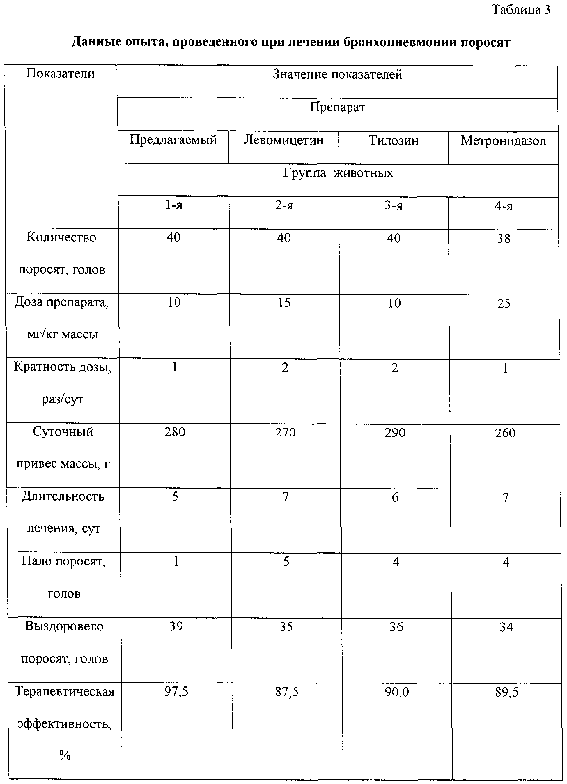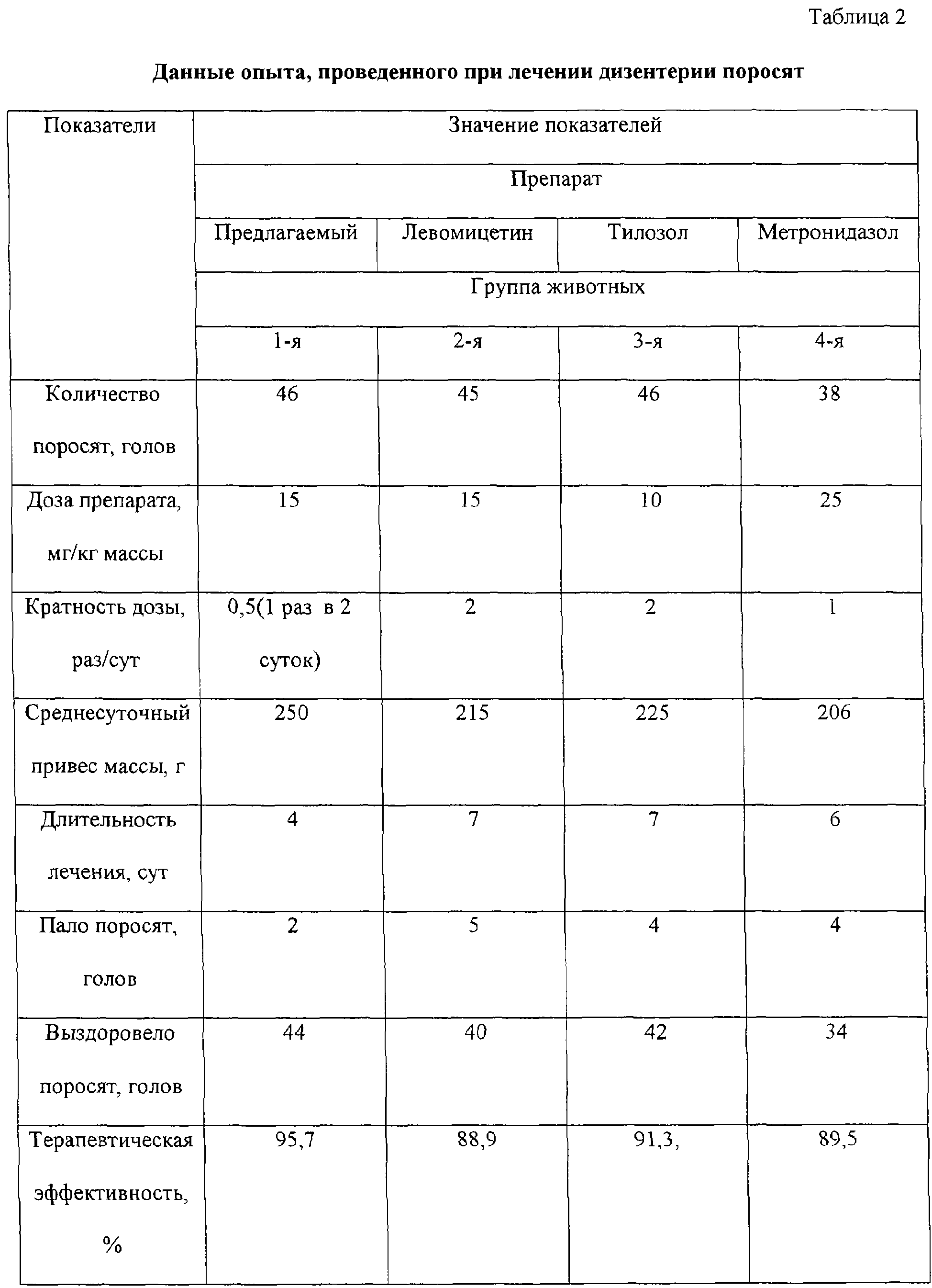 Изобретение относится к ветеринарии и ветеринарной фармакологии. Препарат включает (в мас.%): левомицетин 3,0-10,0, тилозин 2,5-10,0, метронидазол 2,5-5,0, 1 М раствор хлористо-водородной кислоты 24,0, стабилизаторы – формальдегидсульфоксилат натрия 0,02-2,0 и сернистокислый натрий 0,02-2,0 и растворители – бензиловый спирт 2,0-4,0 и 1,2-монопропиленгликоль – остальное. Препарат стабилен (сохраняет свойства до 1 года при 18-20°С), имеет широкий спектр терапевтического действия: может быть использован для профилактики и лечения сальмонеллеза, колибактериоза, дизентерии, бронхопневмонии, некробактериоза, микоплазмоза, лептоспироза и других заболеваний у сельскохозяйственных животных. Препарат эффективен при низких дозах и в ряде случаев он эффективен даже при однократном применении, что снижает стоимость курса лечения.