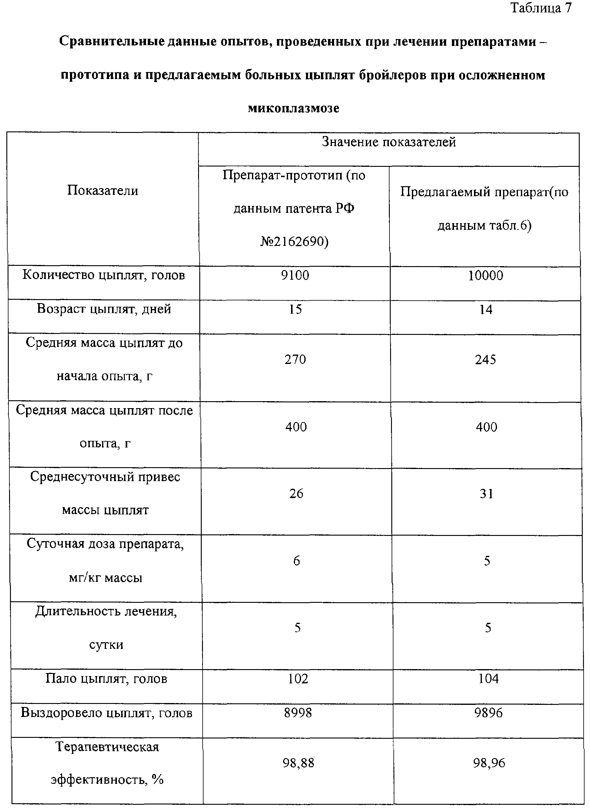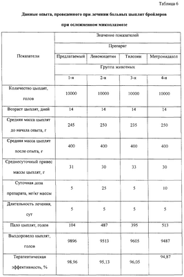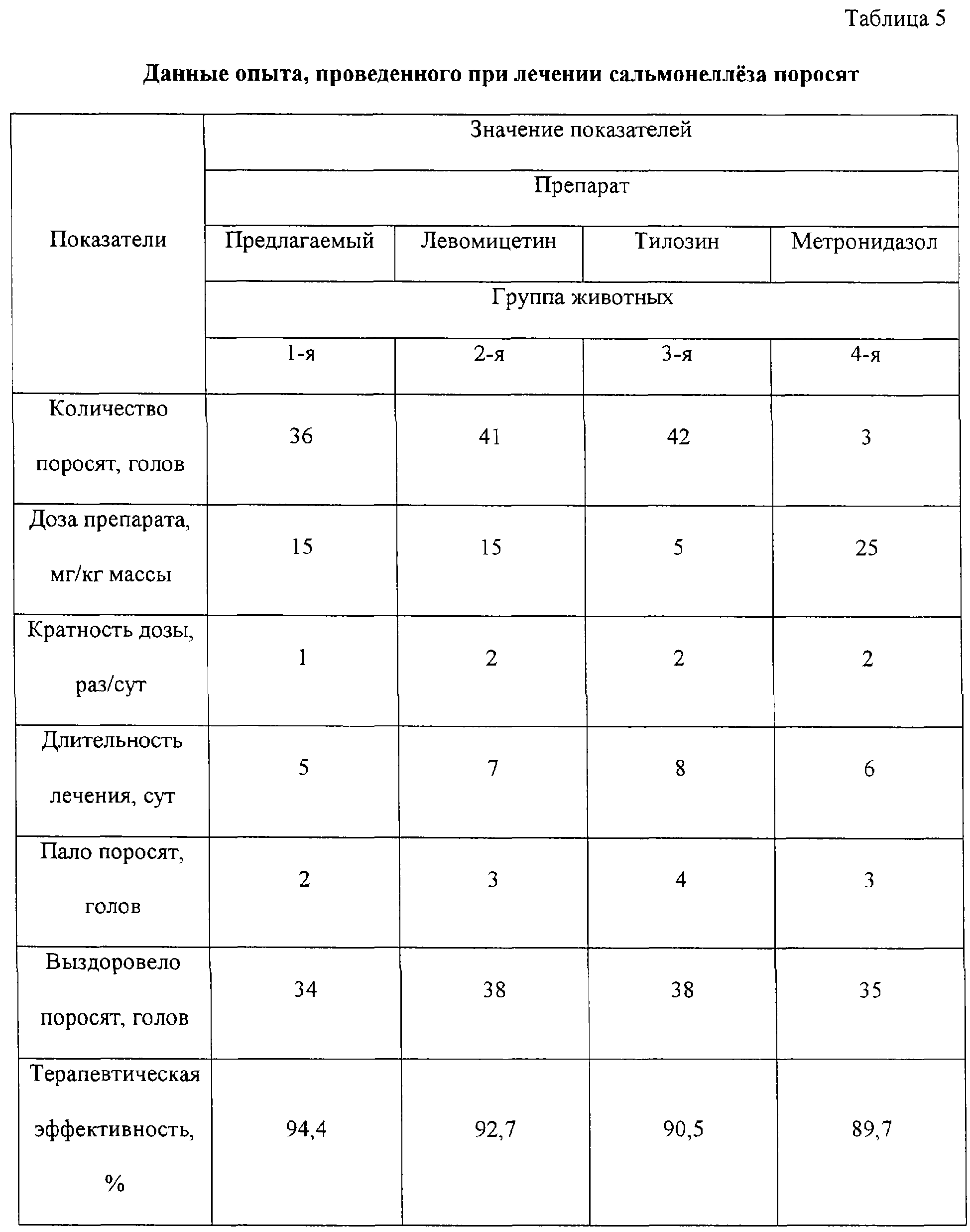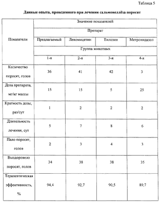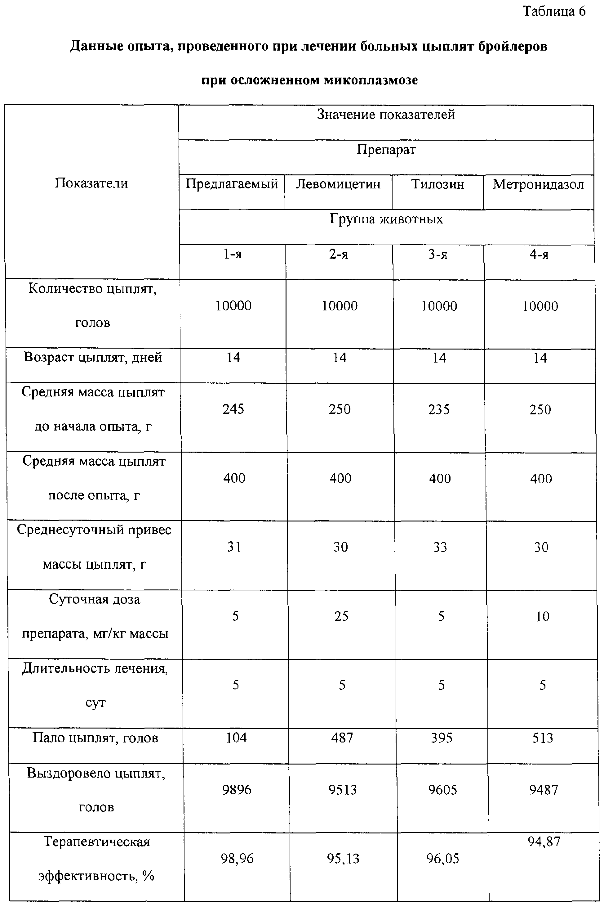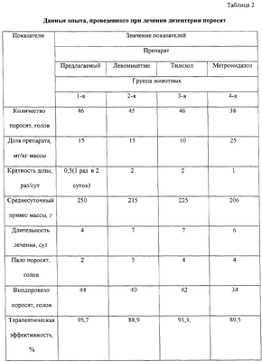 Изобретение относится к ветеринарии и ветеринарной фармакологии. Препарат включает (в мас.%): левомицетин 3,0-10,0, тилозин 2,5-10,0, метронидазол 2,5-5,0, 1 М раствор хлористо-водородной кислоты 24,0, стабилизаторы – формальдегидсульфоксилат натрия 0,02-2,0 и сернистокислый натрий 0,02-2,0 и растворители – бензиловый спирт 2,0-4,0 и 1,2-монопропиленгликоль – остальное. Препарат стабилен (сохраняет свойства до 1 года при 18-20°С), имеет широкий спектр терапевтического действия: может быть использован для профилактики и лечения сальмонеллеза, колибактериоза, дизентерии, бронхопневмонии, некробактериоза, микоплазмоза, лептоспироза и других заболеваний у сельскохозяйственных животных. Препарат эффективен при низких дозах и в ряде случаев он эффективен даже при однократном применении, что снижает стоимость курса лечения.