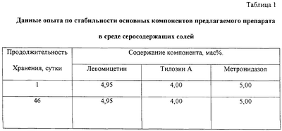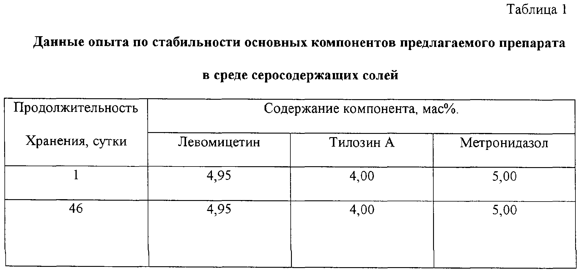 Препарат для лечения бактериальных и/или протозойных инфекций животных, содержащий левомицетин, тилозин, бензиловый спирт, пропиленгликоль и стабилизатор, отличающийся тем, что он дополнительно содержит метронидазол, 1 М раствор хлористо-водородной кислоты, в качестве стабилизатора имеет формальдегидсульфоксилат натрия и сернистокислый натрий, а в качестве пропиленгликоля – 1,2-монопропиленгликоль при следующем соотношении компонентов, мас.%: