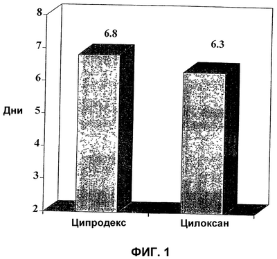На фиг.1 показано среднее число дней до момента прекращения боли в ушах при клиническом исследовании с участием человека путем сравнения действия препарата, содержащего комбинацию ципрофлоксацин/дексаметазон, с действием препарата, содержащего лишь один агент, а именно, ципрофлоксацин.